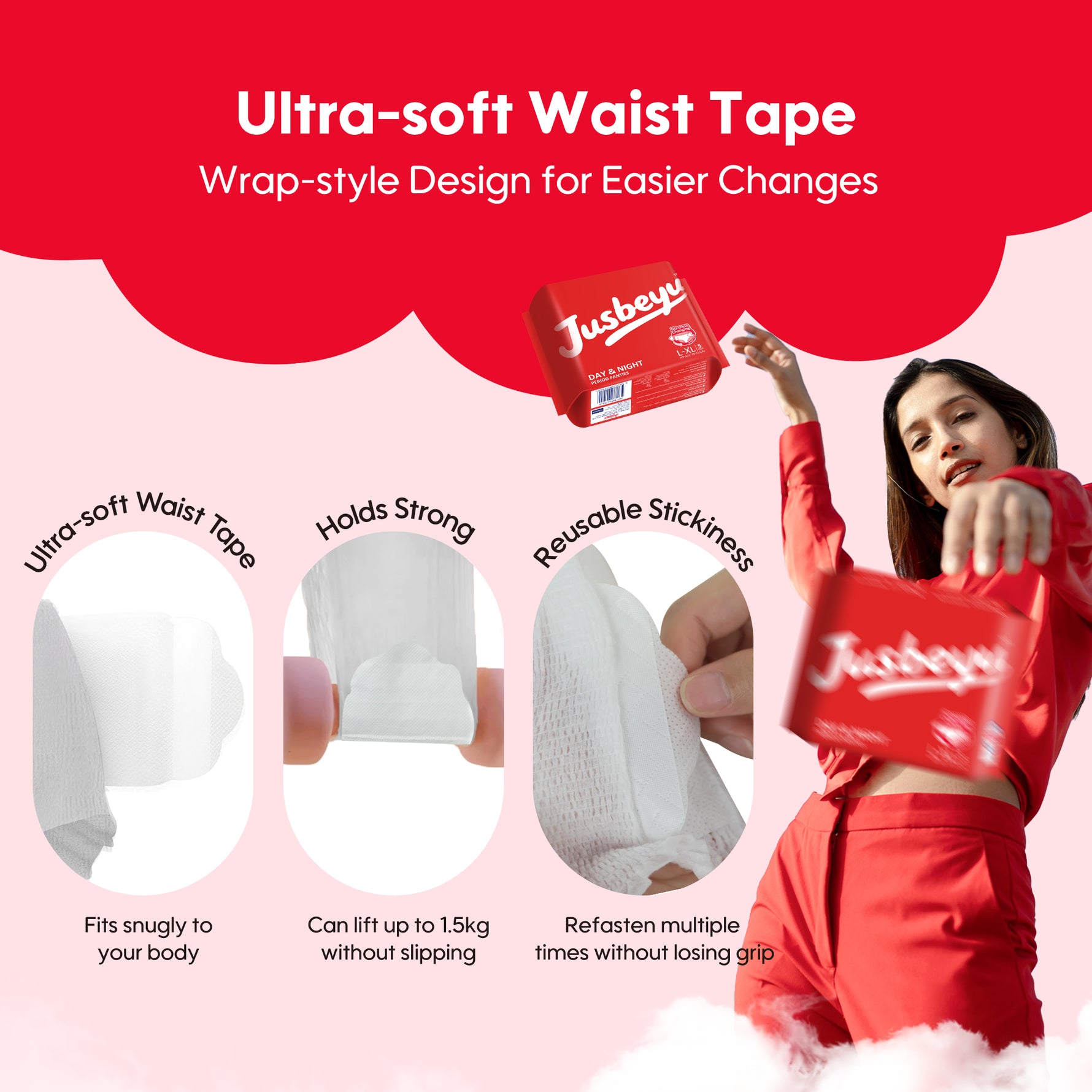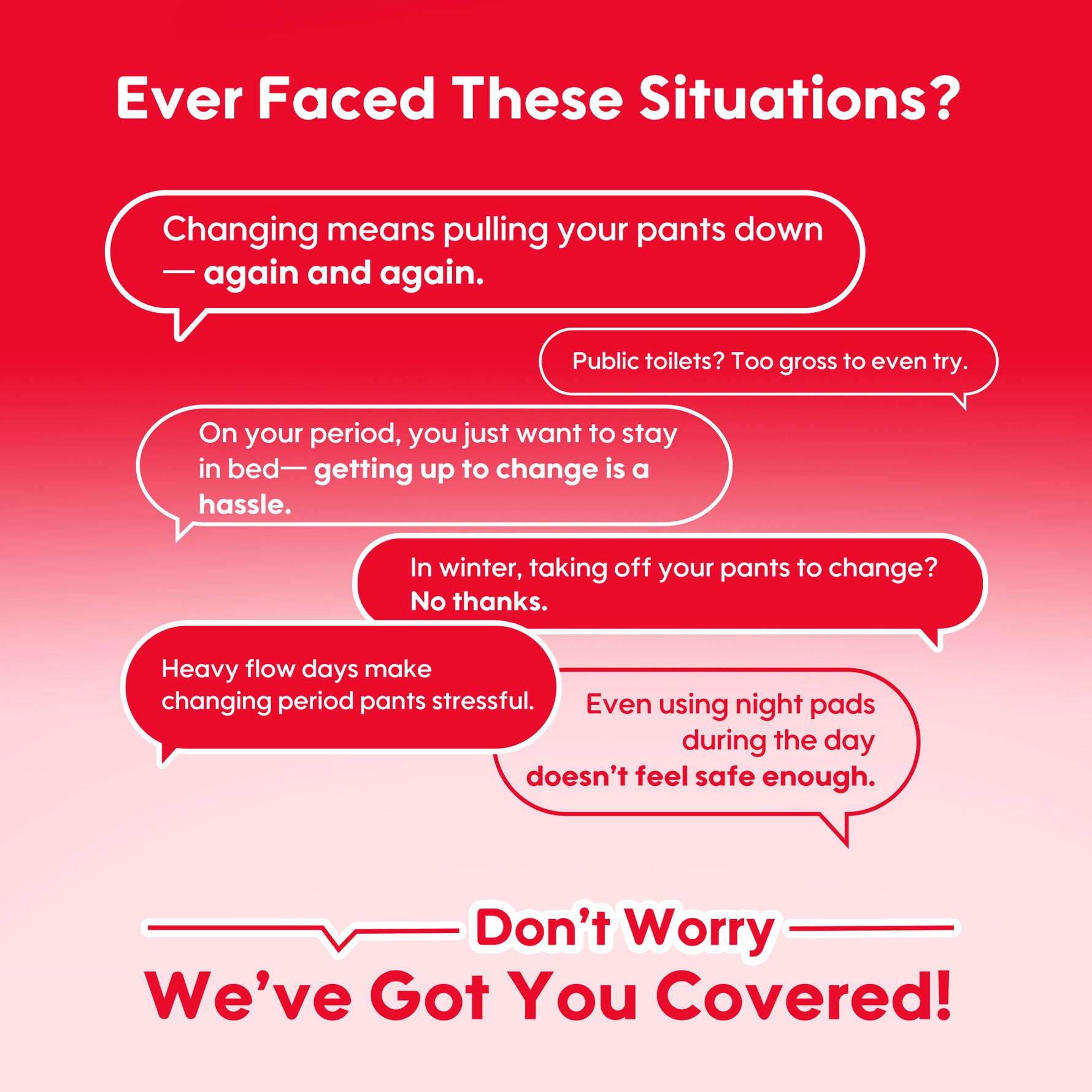 To change them, you don't need to take off your pants or skirt. Just tear open the easy-tear sides like a bandage, pull the used part out from the side, and then put on a new pair. Slide the new ones up one leg, adjust to a comfortable fit, and secure the side velcro tabs. The whole process can be completed in under 15 seconds.